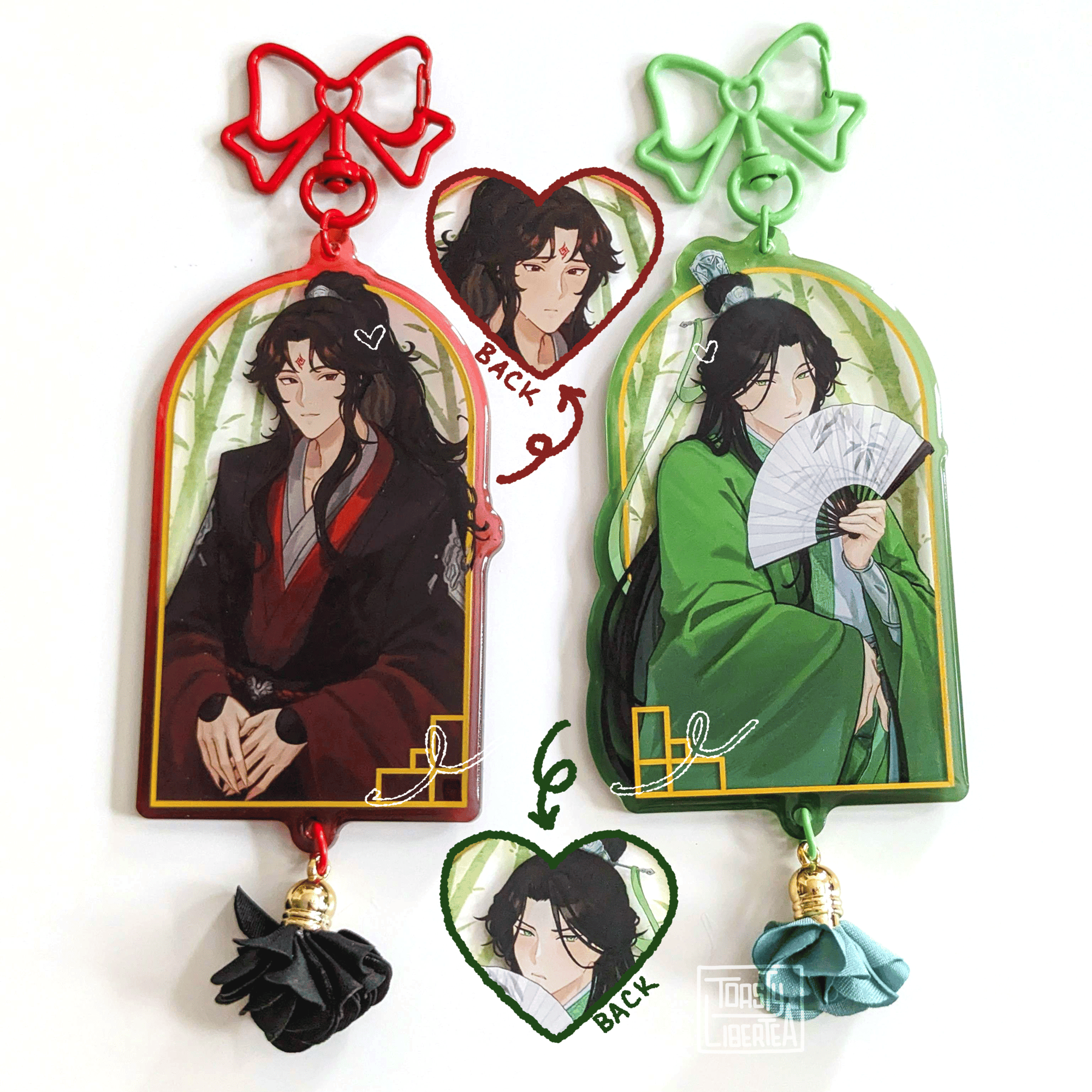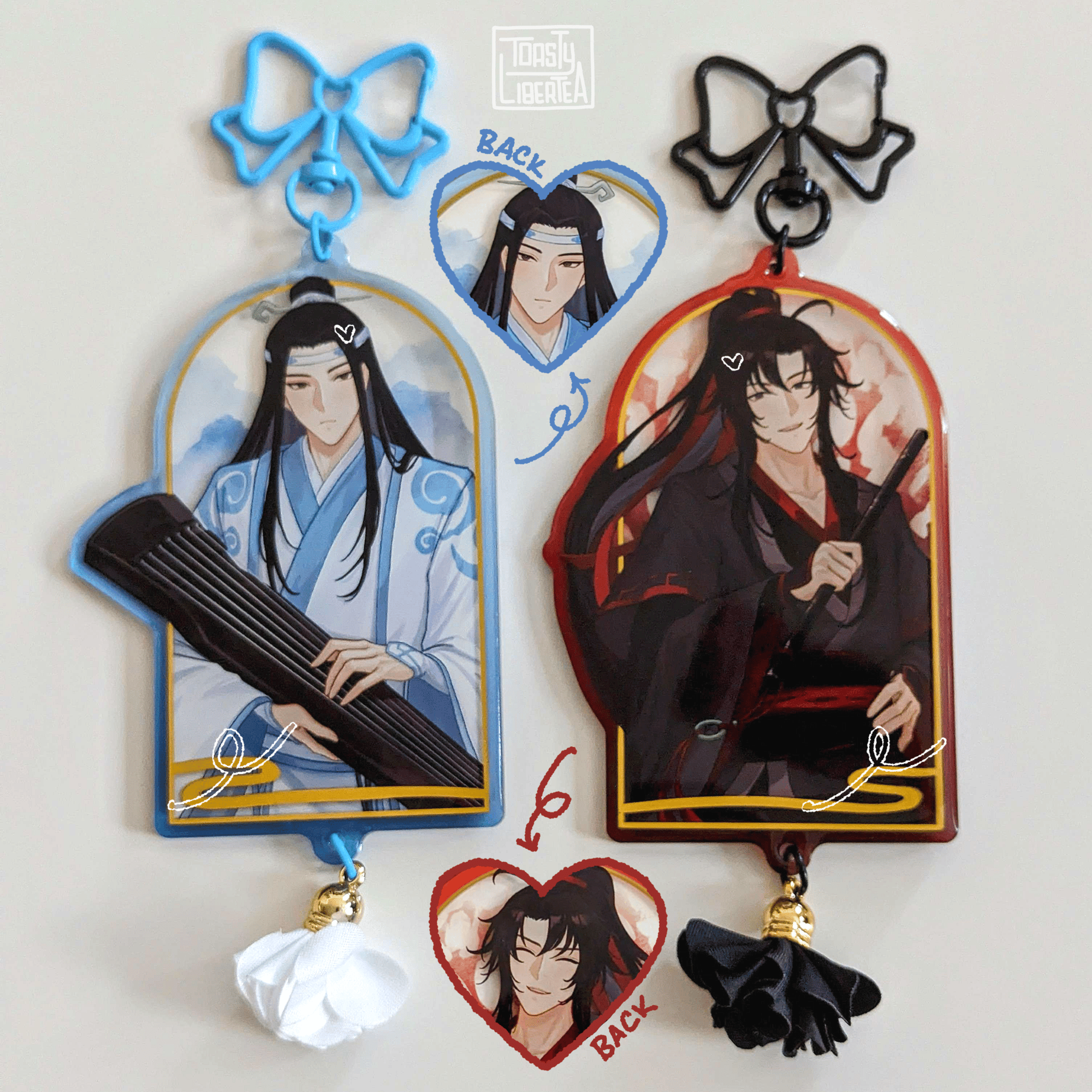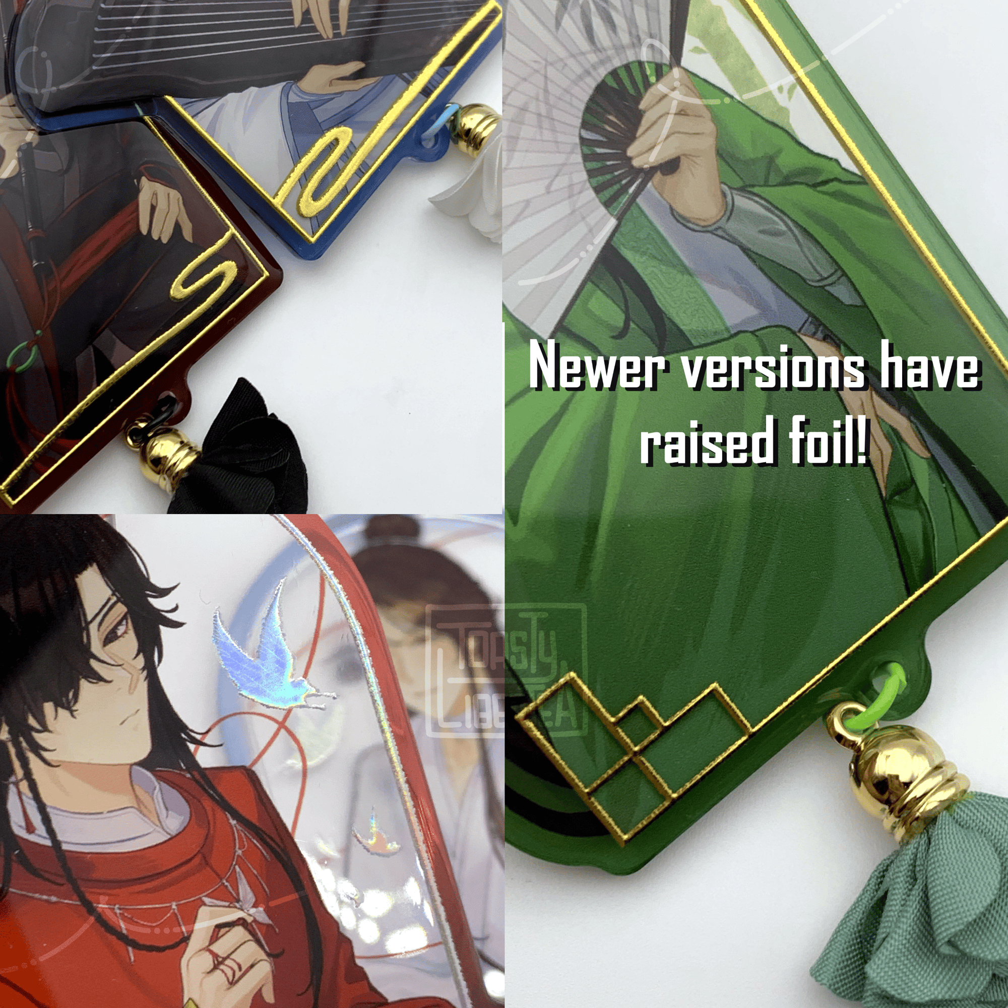 My manu has changed their foil methods, so my current restocks (except Luo Binghe) have different foil effects. The newer versions have raised foil instead of flat, and the silver foil for HuaLian is holographic. Please refer to the photos for what they look like.